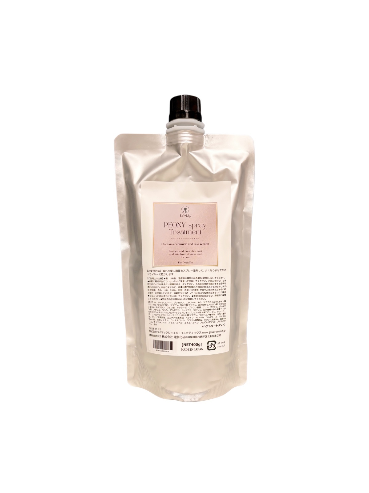 『PEONYスプレートリートメント』は、被毛にうるおいと自然なツヤを与える、ミストタイプのトリートメントです。